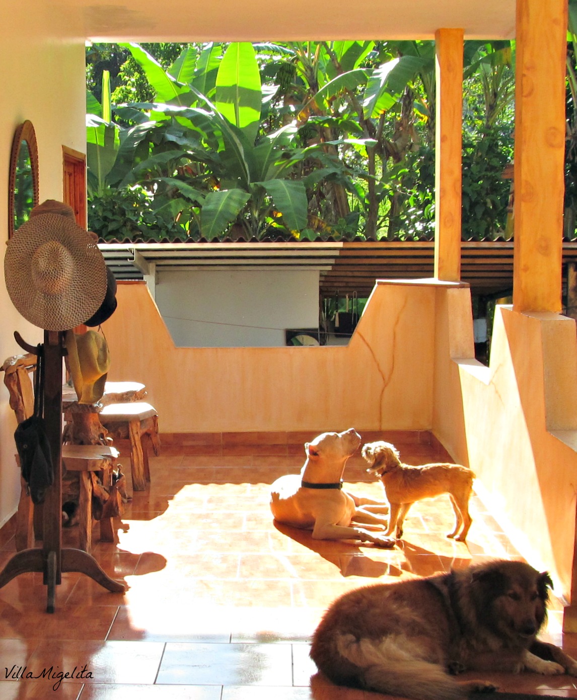 I swear I can see Luci smiling as she explores the durable stems without leaves. Hummingbirds come to the feeders, the whir of their wings now heard on my patio. The hummingbirds are all around Villa Migelita , but now there is a new spot to sit where they come regularly to feed. The branches also hold cut plantains to attract wild birds. This is the way we feed and attract birds here in Colombia, regular feeders filled with seed never work. Birds here have many fruits to choose from, and they will only come to fruit on a tree. I am anxiously awaiting to see my first bird come feed! This tree has also brought a change in my day; I eat lunch outside with Luci and my dogs. I sit in the afternoon studying Spanish while the hummingbirds hover nearby. What a great redemption for my Guava tree; still being used to attract birds while also allowing Luci to perch up high. I look at the beautiful scene and I smile thinking that this dead Guava tree is serving a purpose after all sending positive energy into the air, attracting life just like it did before. The branches are bare but they still reach to the sky and call nature to its side.