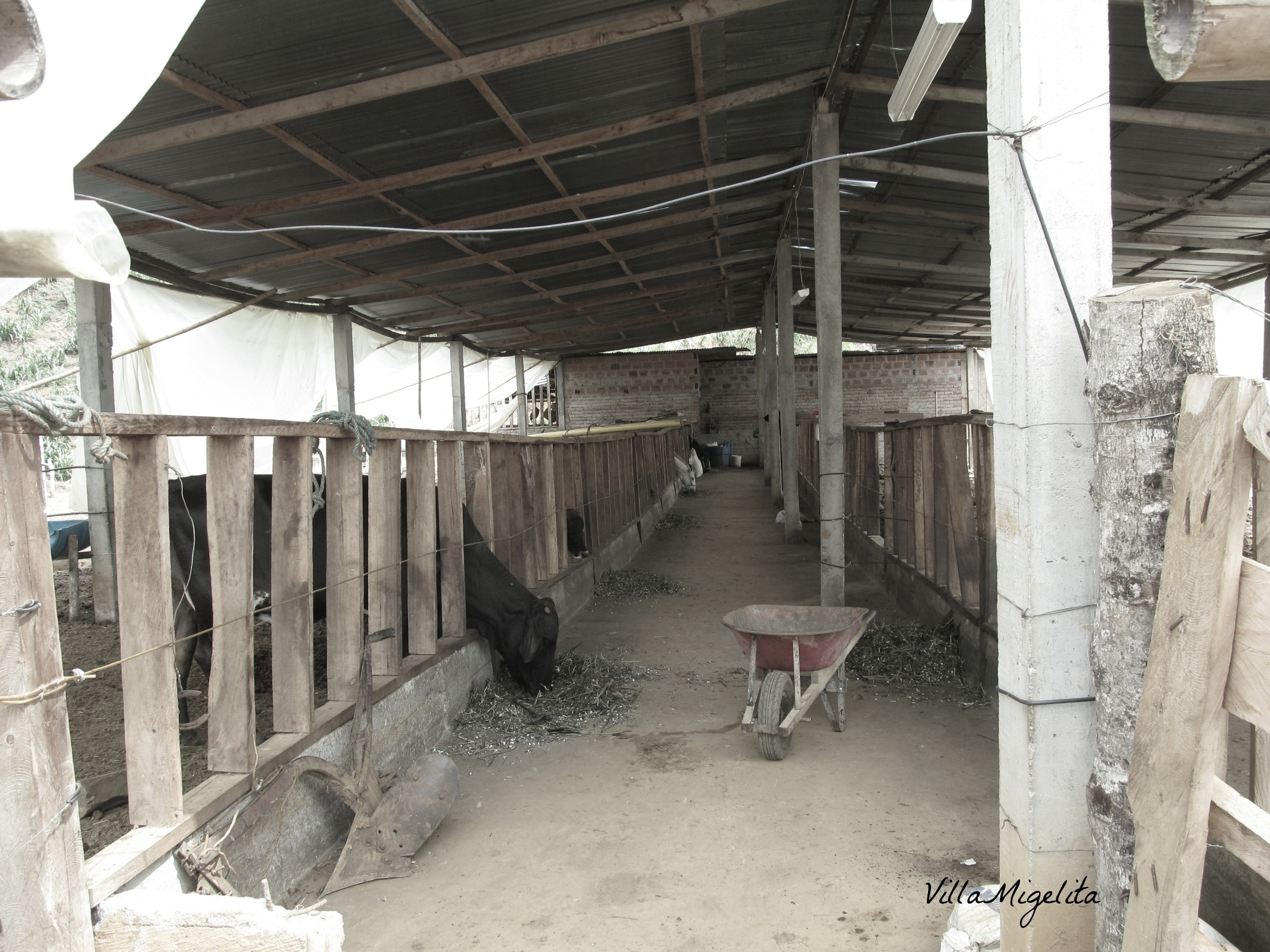 A click of the camera and you have a memory forever. This photo shows the charm of a Colombian farm that is in the process of being constructed. A work in the making. I remember as I walked by the animals feeding that I loved every detail that my eyes were taking in. I loved the way I could pet the animals as I passed. The tiny details from the wheel barrel to the wires that hang down in the front. The plastic used for shade and rain cover. The length of the passageway captured. Everything about this photo encompasses a working farm in Colombia. This scene unfolds in a way that reaches deep inside me; the suppleness of the minutiae. Every time I look at this photograph I see something else that charms me, and how I was feeling at that exact moment, delighted.